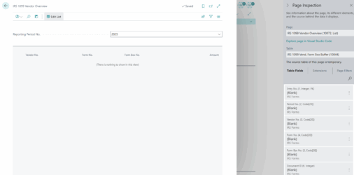 IRS 1099 Vendor Overview page in BC 27.2 does not populate despite valid IRS Reporting Periods and propagated 1099 data. Page inspection shows temporary source table with zero records. Legacy 1099 reports return correct data. Issue persists with SUPER permissions. Anyone else seen the same and have a line to Microsoft to make them aware? @SteveChinsky