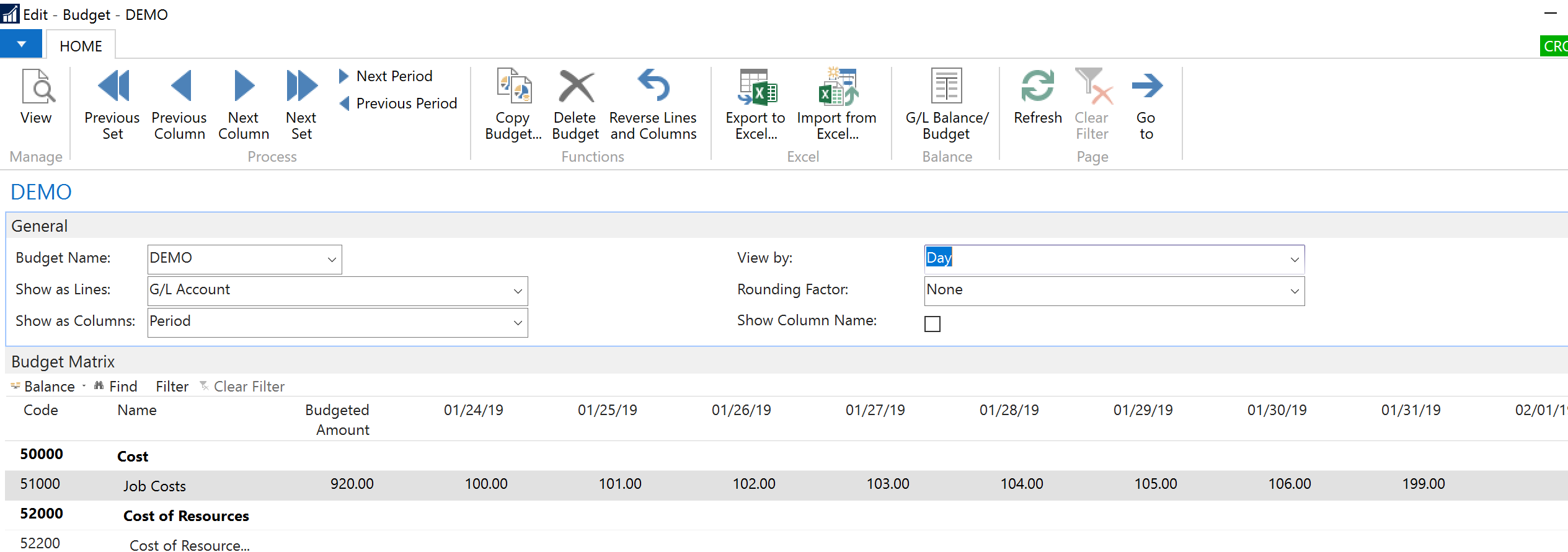 I created a new budget and for a particular G/L Account (51000), I entered budgetary amounts at a daily level as shown below (View by is set to Day, and amounts appear for 01/24/19 to 01/31/19):