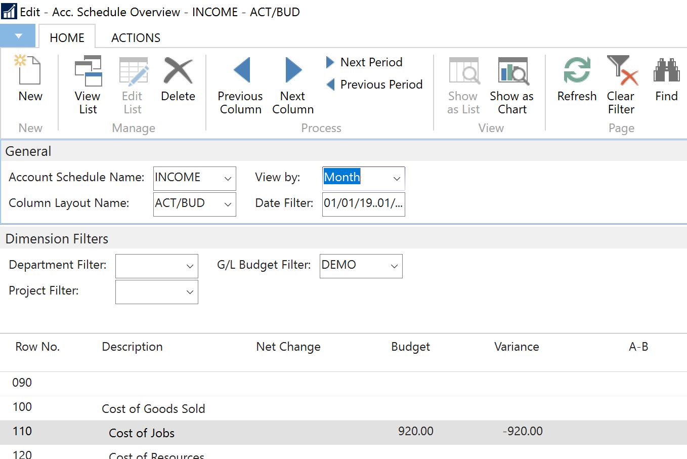 I subsequently went to my Account Schedules, and ran my Income Statement with and Actuals vs. Budget Column Layout.First, I viewed it at the month level, and you can see it shows the combined Budget amount of $920 (consistent with the budget screenshot above):