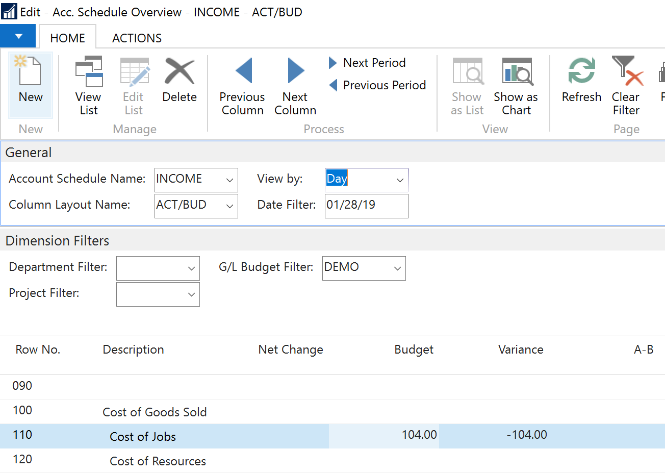 Then, I changed the filter to Day, to 01/28/19, and see the Budget column showing $104 (again, consistent with the Budget in the first screenshot for 01/28/19):