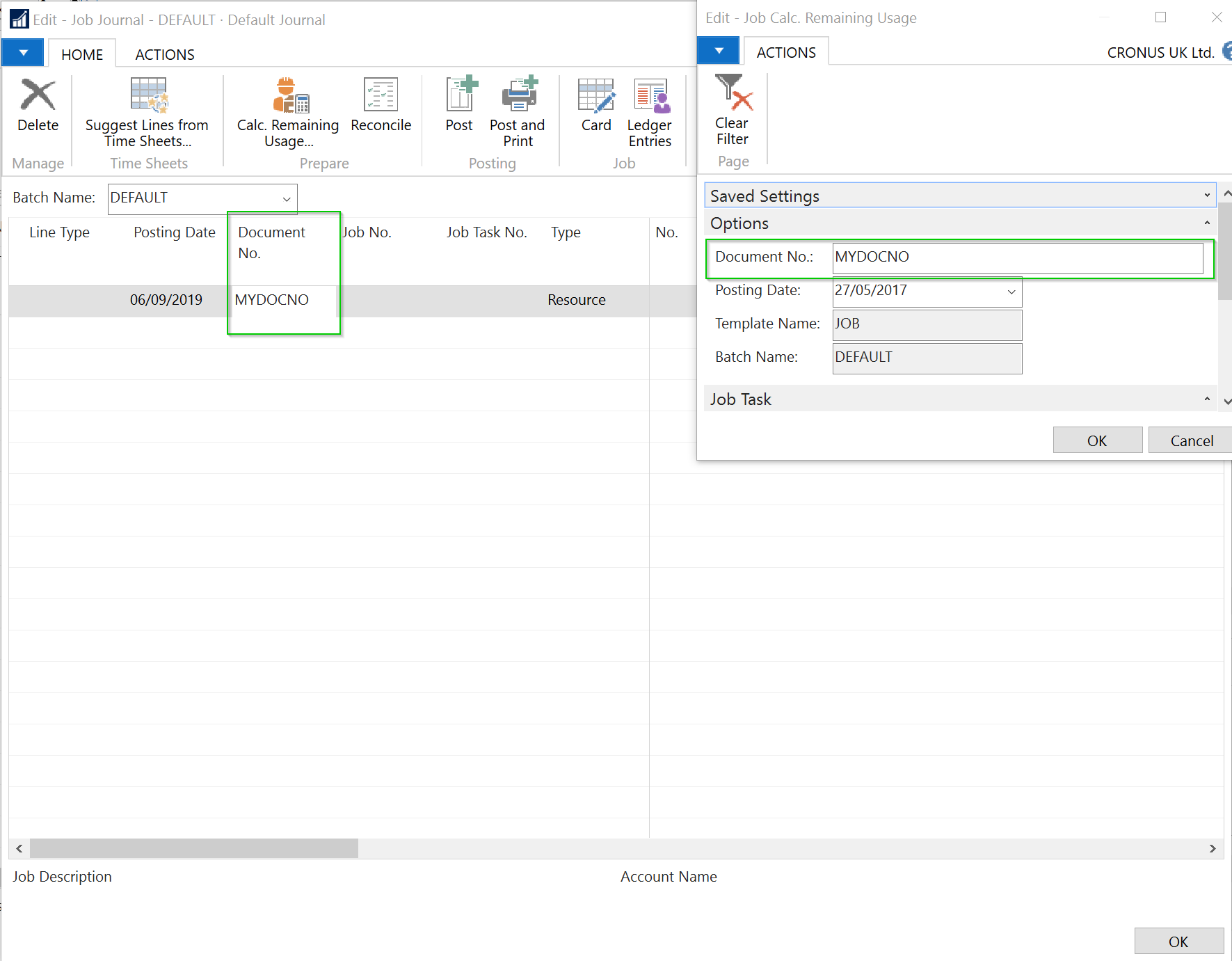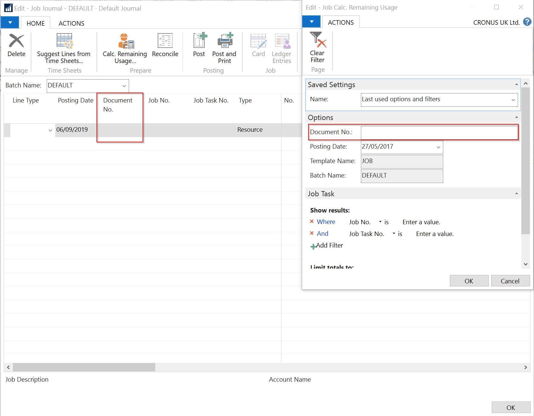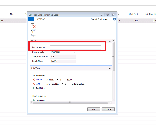Hi MichaelThe document no. is retreived from the line selected when the Job Calc. Remaining Usage is invoked. Ā Below are screenshots of two examples; one without a document no.and one with a document no. Ā As far as I am aware, when the user invokes the process, it simply copiesĀ the template name, batch name, and the document no. to the option fields.