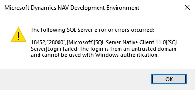 The computer runs Windows 10 and uses a local account which matches the domain authentication rather than being a domain member. We have set windows credentials to allow the computer to access the SQL server which allows Nav 2017 to run just fine. But the Nav Development Environment doesn’t seem to like the setup. It was working until recently when we removed all the credentials to try and fix an issue where the Nav Development Eviro gave this same error when using VPN.