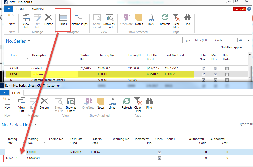 Highlight the number series code you desire and then click “Lines” from the ribbon. Add a new line with the new numbering series along with the starting date for when you want the new series to begin. That should do it.