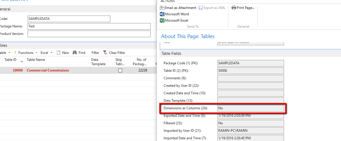 – I created the configuration package which has a table 38 and 39. I included the shortcut1 and 2 as well as other 4 dimensions (Dimension as Columns is set to Yes)
