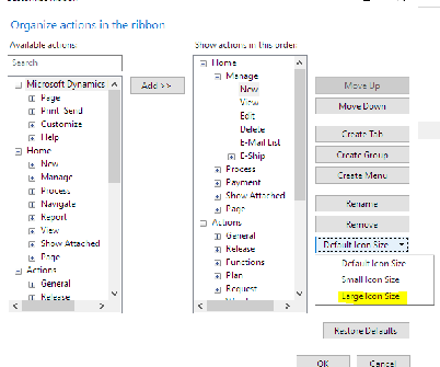 Go to the blue box at the top left and choose customize ribbon. When you highlight an action [icon] on the right box and go to the Icon Size on the far right you can choose Default, Small or Large.