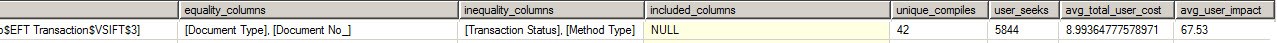 The table object was modified to support SQL Server’s recommended index configuration, so in NAV the EFT Transaction Key SQLIndex field for the [dbname$EFT Transaction$VSIFT$3] key was changed to Document No.,Document Type,Transaction Status,Method Type.