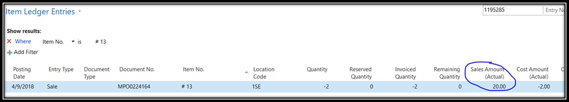 Item Analysis View Entry of Analysis Areas Sales and Inventory do capture Sales Amounts for this type of entry, $20 in this case.
