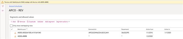 We are attempting to revamp our account structures to take effect at the beginning of the year.Ā The old structures will need to be available until April for potential entries for 2019, thus the new rules will need to peacefully coexist for part of 2020.Ā We have expired the old structures and advanced rules as of 12/31/2019 and set the new rules to take effect starting 1/1/2020.Ā When we attempt to add the new structure to the ledger of the legal entity, we get errors that the main accounts overlap with the old structures.Ā If we attempt to do this within an account structure as shown below, we get a similar overlap error. Ā