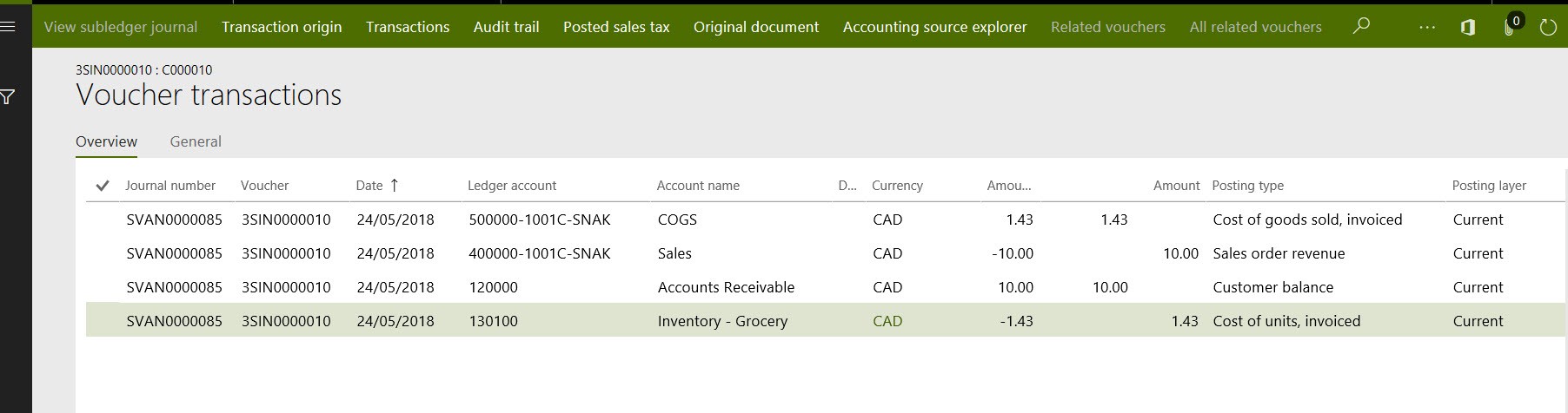 Thanks for posting the original journal.Ā The only thing that really surprises me is the financial dimensions.Ā I would have expected the reversal of the margin to use 1001C-SNAK not just 1001C as per the original transaction.Ā Any idea why it is dropping the last component of the dimension string?Ā Does the account structure for the write-off account not include that component of the dimension string?