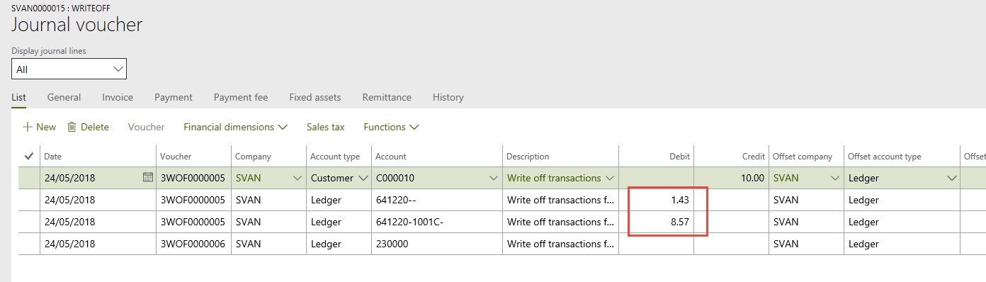 If this does not help and if you are able to replicate the issue I would suggest to contact the MS support because to me the write off transaction does not look correct.