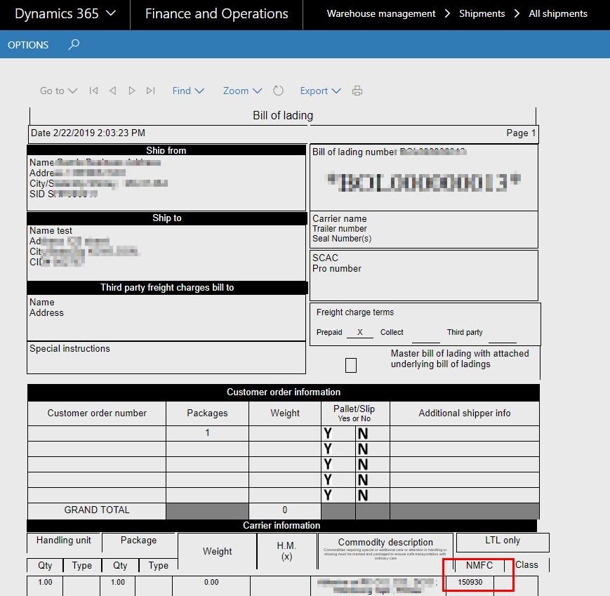 Yes sorry I forgot to reply about this part. This includes the NMFC on the Warehouse Management Bill of Lading which I think is different from the traditional BOL that you could get from Sales orders or WMSI and WMSII. This can be printed if you have WHS Shipments in Warehouse Management > Shipments > All Shipments. The Bill of Lading can be generated once the Shipment status = “Shipped” and it will display the NMFC. Note: the NMFC assignment to the products is a prerequisite to generate the document, if items are missing NMFC, an error will be thrown and it will not generate the BOL:——————————