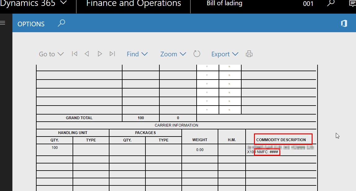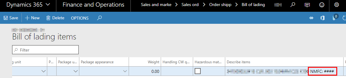 I do not believe there is any parameter to display the NMFC on this standard form. You would have to modify the report format to include it. A workaround could be to manually add the NMFC in the “Describe items” field of the Bill of lading items form. This isn’t great since it’s manual for each order and prone to errors but it does display the field on the standard document: