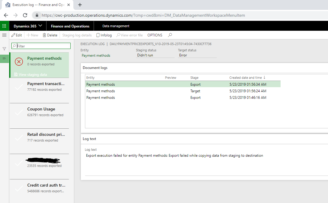 2. Select the data entity that is failing.Ā There should be two entries in the Document log.Ā One for target and one for export.Ā Select each and evaluation the Log text for an error.
