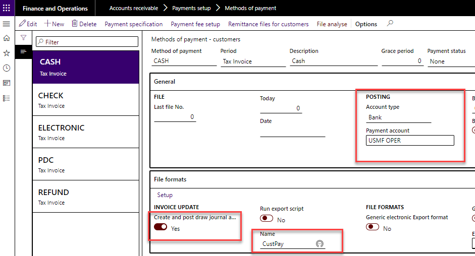 What this does is it automatically posts and settles the payment journal once the sales invoice is generated in D365, to the assigned bank as per the method of payment = Cash setup.Ā