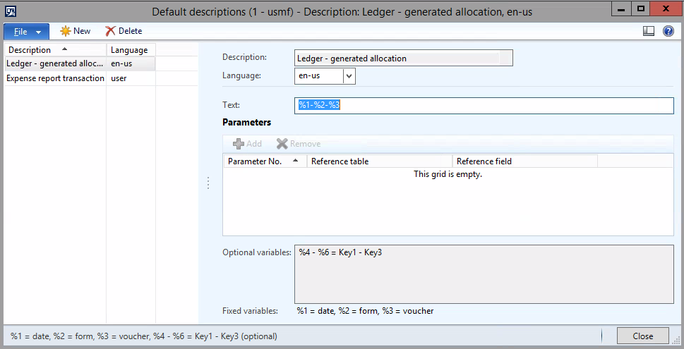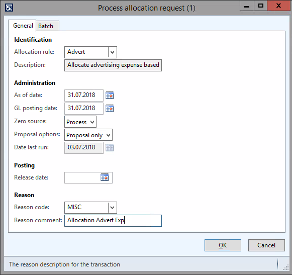 Hello, The reason code can be entered directly in the allocation process form: In addition, we have the default description functionality Processing such an allocation results in the following outcome where No 1 comes from the reason code specified and No 2 from the default description The error message that you have seems strange because you can flip the reason code and default description before the journal is posted. There should not error message pop up.
