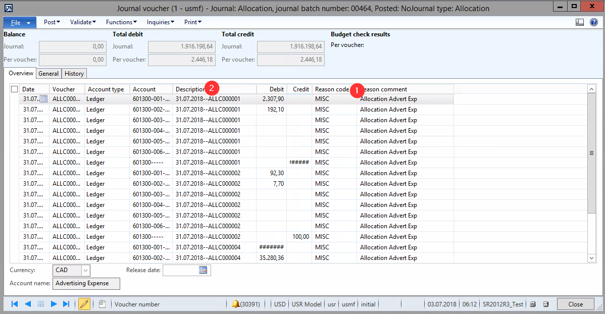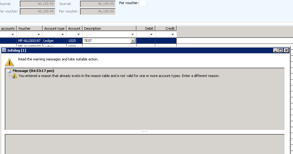 We use the allocation journals to post a number of transactions to multiple companies at once.Ā I’ve tried adding a description but i keep getting the error message below.Ā When we process an allocation request, we have an option to select a reason code.Ā I’ve tried selecting one and not selecting one.Ā And both give me the same error.Ā The reason we want to add a description is that when we process the allocation request, the description field is blank.Ā It would be much easier to identify each of the allocation entries since we multiple entries now.Ā Where can we change/add a reason code?Ā Thanks