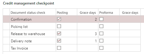 Grace days in the new Credit management allow for a period of time where the blocking rules get bypassed during the grace period after a successful run at that specific level. For example, you confirm a sales order, D365 reviews the order against the blocking rules as established and everything passes without a credit hold. In your example, if you can run through the other examples selected (Release to warehouse and Delivery note) over the next two days, then credit management blocking rules will not be checked.Ā