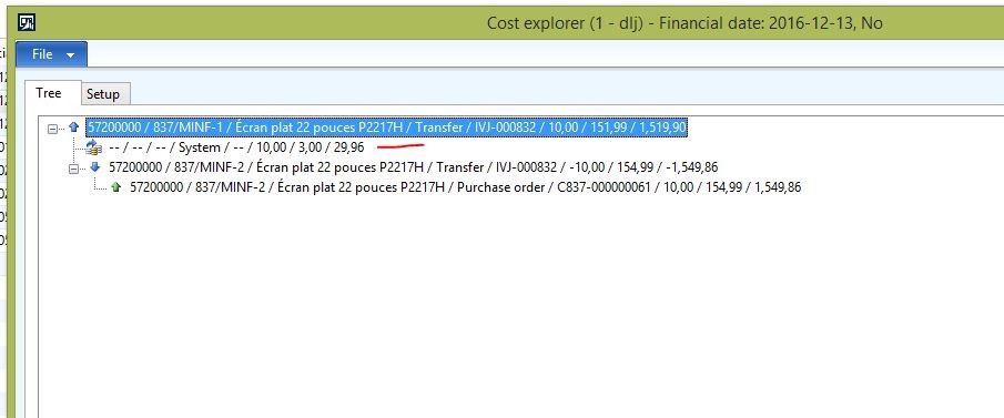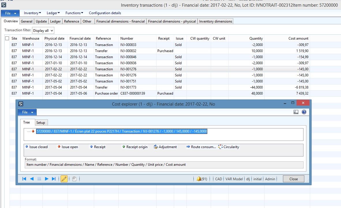 As we understand it, – The receipt from the transfer (IVJ-000832) should have been adjusted from $1450 to $1549,86 because the issuing side of that transfer was adjusted to that amount.Ā It was only adjusted to $1519. – The 3 issues at $145 should have been adjusted to $154.99, but the cost explorer shows them as “open issues”.Ā Ā Ā We don’t understand why and we don’t know where else in AX to look for an answer. – TheĀ “gap” in the receipt adjustment ($1549.86-$1519.90=$29.96) matches the gap in the open issues ($154.99-$145*3 = $29.97).