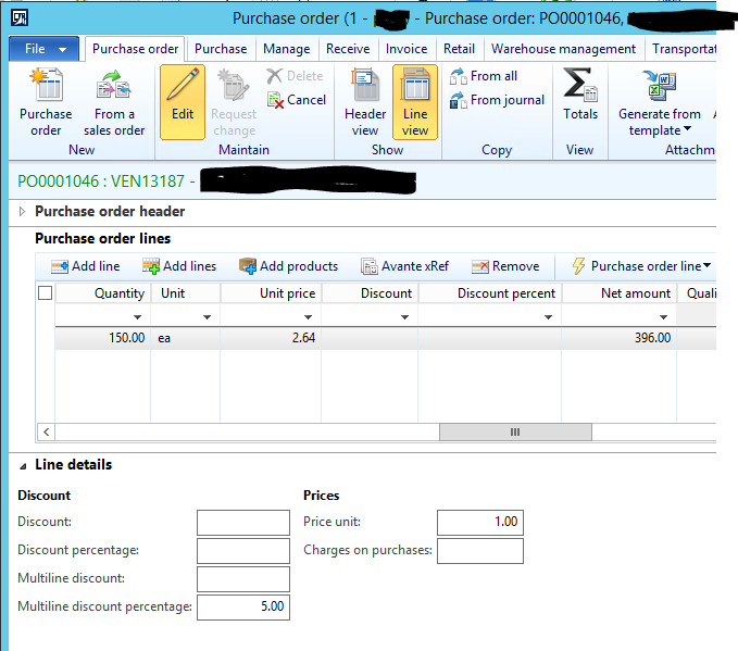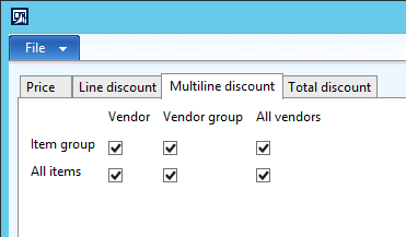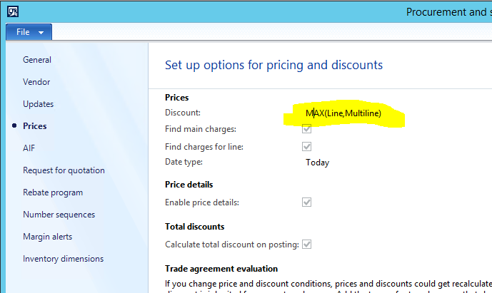 I am setting up Purchase trade agreements and I can’t seem to get the multi-line discount trade agreement to work properly. I have enabled all options in the ‘Activate price/discount’ setup in Procurement and sourcing. I have created an item multi-line discount group and added the item to it. I have created the trade agreement entries for price and multi-line discount. (The PO confirmed delivery date falls within the active date range for both trade agreement entries) As you can see on the PO, the discount field on the line entry remains blank BUT when I click ‘Calculate multi-line discount’ on the purchase tab, the line details indicate it found the discount. But it doesn’t get applied!Ā The totals display indicates the discount isn’t being applied. So, any ideas on what is wrong?