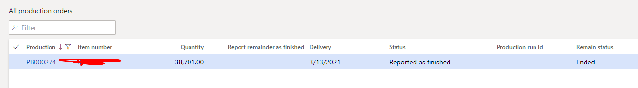 Production order is now in status Reported as Finished: