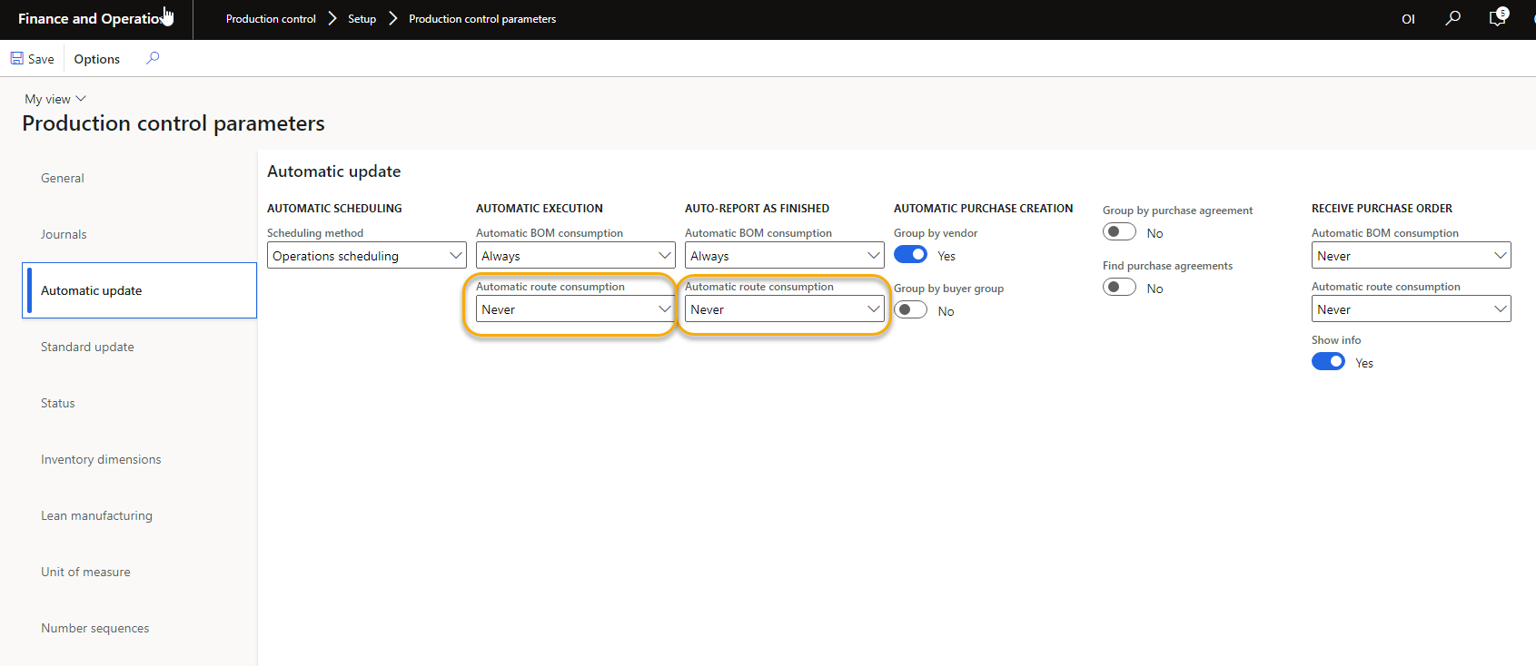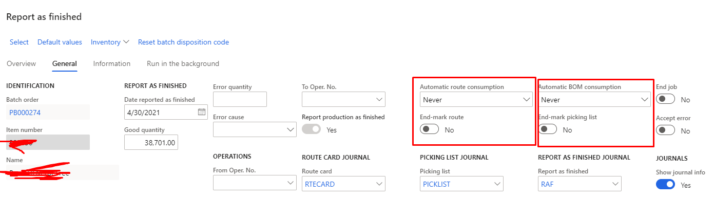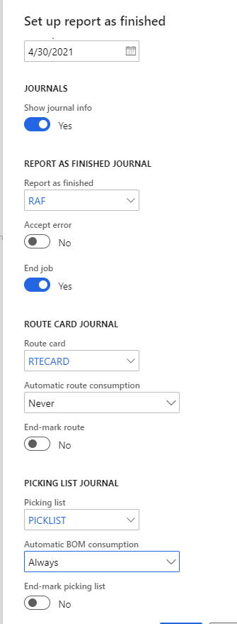 #FinanceandOperations Is it possible to Report as Finished a production order before posting a Route card journal? We don’t want to Accept error because that allows for other unintended consequences. Our production items have BOMs and routes that are used for estimating and scheduling. We use the standard production process of starting an order, posting a picklist, and then RAF’ing. We do not post a Route card prior to RAF because of a Kronos integration that posts actual operation time after the RAF. The delay between RAF’ing and route journal creation is due to a time card approval process. Creating and posting a manual route card with no time enables the RAF process but it seems like there should be a better way.