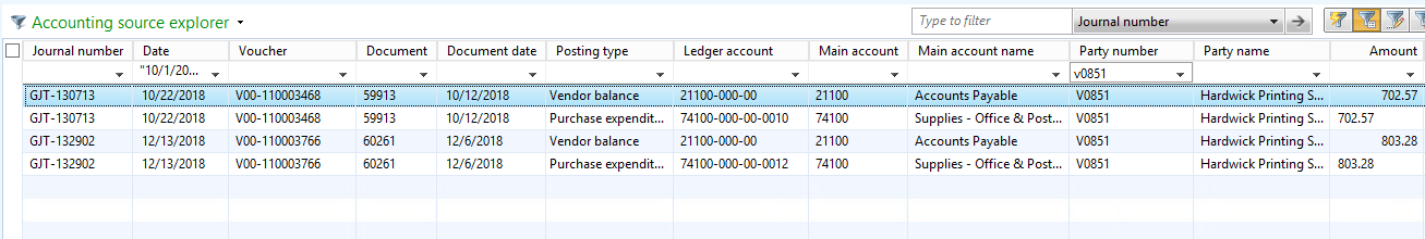 ?Hi Zvika,On mine (in AX 2012 R3), there are columns for Party Number and Party Name. These will display the customer or vendor information as appropriate to the line. I’m not sure if they are visible there by default or if I added them via a personalization. With those columns, I can filter by vendor very easily and it shows the general ledger account and amount, along with the vendor number and vendor name, for each line of the transaction – both debit and credit side. See the image below – I reordered the columns for clarity.