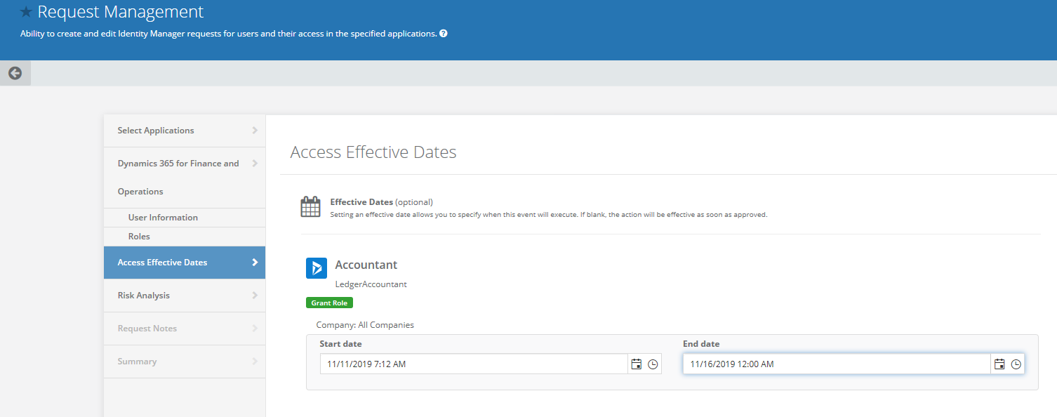 For example, if I wanted to specify when a user should be granted a particular role I can set the start date and end date of the access. And once the request is approved, the user will be automatically granted the role on the start date and revoked the role on the end date (which can be set down to the minute).