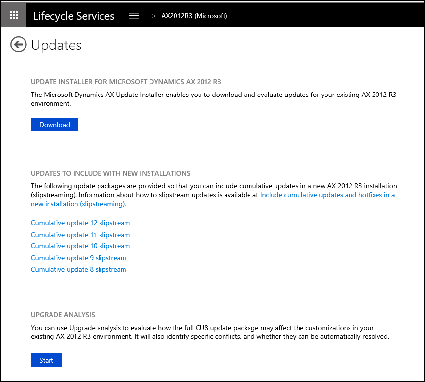 4. Go to LCS and pull a Slipstream version of R3 CU12 (for example). The Slipstream versions may contain patches to the upgrade process. An upgrade from RTM to R3, brief stop, then on to CU12 will be more difficult. Learn about LCS (https://lcs.dynamics.com/v2).