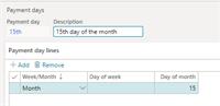 Hi,First, create a Payment Day (like ‘D15FM’) with Week/Month = Month and Day of month = 15.
