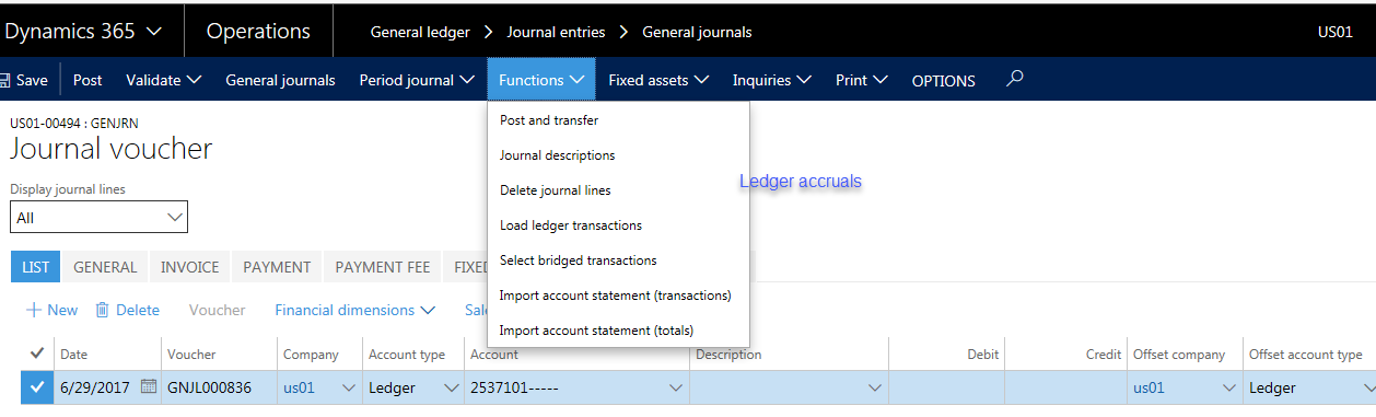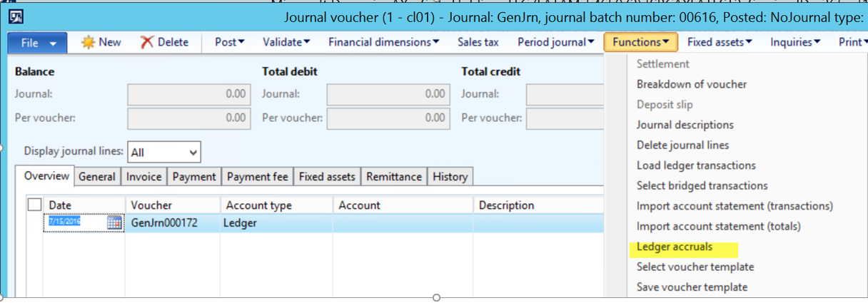 ?Hi Kim, In the middle of the Screen you have the list, general, invoice, … tabs. Right below you have the +New, Delete, … functions. If you open the last one there – denominated ‘functions’ – you can find the ledger accrual functionality again. Best regards, Ludwig