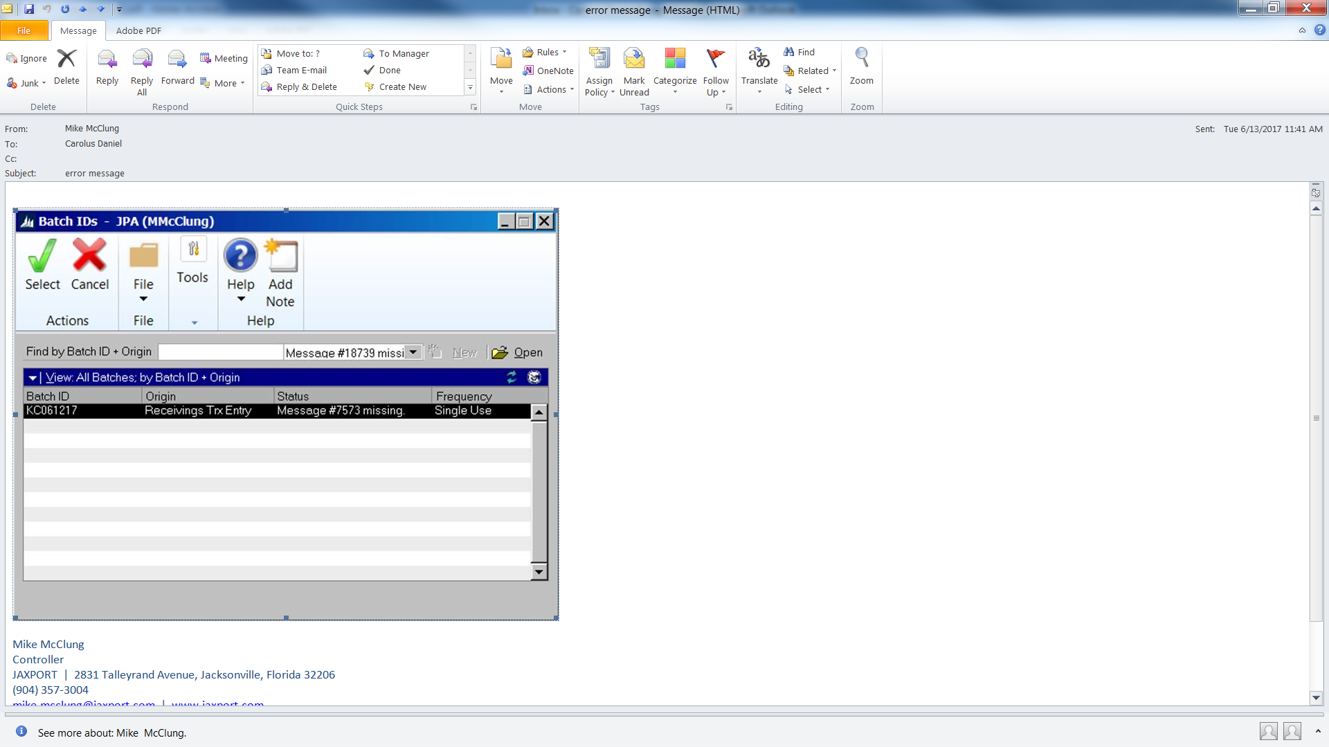 - The one with the status MESSAGE #7573 missing is: KC061217 (a Receivings batch)