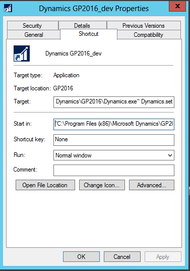 ...Windows:C:Program Files (x86)/Microsoft Dynamics/GP2018/Dynamics.dic:C:Program Files (x86)/Microsoft Dynamics/GP2018/Data/FORMS.DIC:R:GP2018/OCI/REPORTS.DIC...Lastly, you’ll need a shortcut that launches Dynamics and points to the modified .SET file.Ā To do this, make a copy of your Dynamics shortcut and modify the path (right-click on the icon and choose “Properties”).Ā All you have to do is add the name of your modified .SET file to the end of the “Target” section (see example below).