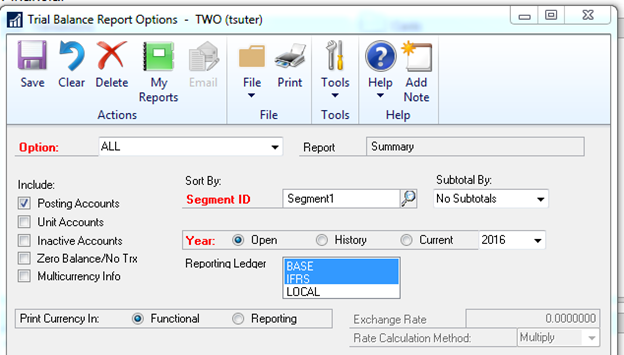 When running the GL Trial Balance Reports you can select in GAAP or IFRS or both! See screen shot how both BASE and IFRS is selected. This is nice as you can run your TB for GAAP and your TB for the foreign entity without having to add two reports together. Or you can just run the IFRS standalone.