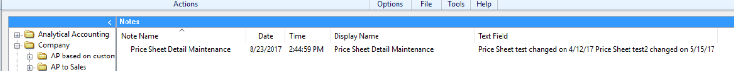 But… I added a window note and was able to create a SmartList to pull it (from table SY0700).Ā Only problem is that since it’s a window note, it’s not price sheet specific.Ā I did add 2 lines of notes to reflect different price sheets, but that could be cumbersome if you have a lot of sheets – and tough to parse.