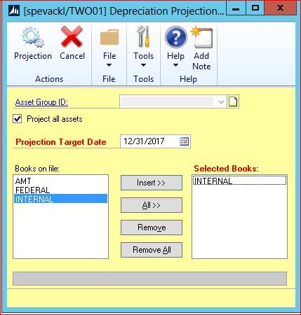 What I actually did at one client is make a smartlist on the Projections Report Master table (FA41900) so that anyone in the dept. could run a projection and others could view the results (export to excel to review or whatever the case may be). They just “search” by userID to get one set of results related to whomever ran the projection, in case 2 users happened to run a similar projection (to avoid duplicate results, as the same asset ID could be “projected” twice, one per user).