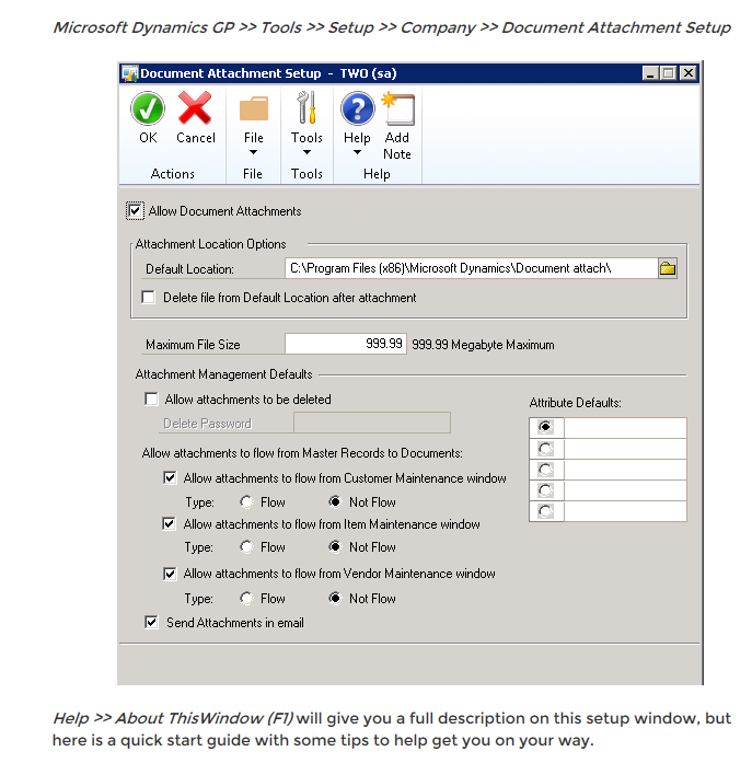 ?I’m sharing the notes I saved when I set it up in one of our companies: And the 2 security settings (Document Attachment Inquiry and Document Attachment Management) Hope this helps.