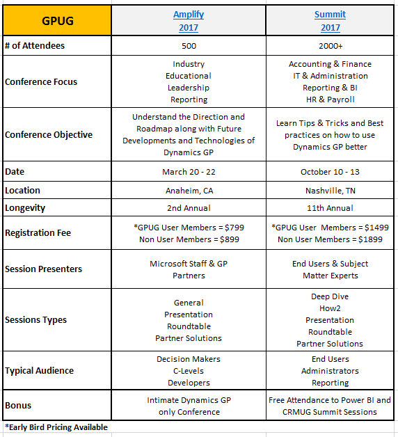 I’ve always heard that Amplify is more “big picture”, and is more geared towards your managers who make the decisions of the future direction of technology for your company. Whereas, GPUG Summit is USERS interacting with other USERS, and is more geared towards the system administrators, the accountants, the financial analysts, and the folks who use the software day in and day out. Don’t get me wrong, both conferences have sessions for everyone, but there are a LOT more sessions (and also pre-conference training opportunities) at GPUG Summit.One thing that is interesting is with Amplify they advertise “Connect with microsoft reps”, but at GPUG summit, they had a huge booth for Microsoft and I was able to meet and talk with the product managers and tech support engineers who I work with day in and day out to support GP… So I think while there may be a bigger presence of Microsoft at Amplify, there certainly was no shortage at GPUG Summit. šI’m hoping to attend both this year, especially since Anaheim is driving distance to my house, but we’ll see what the boss says. š——Original Message——