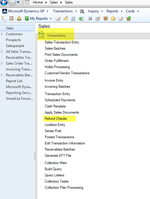 - The Refund Checks process can be done to create a refund for a specific document or customer, and it can also be used to pull in all credits for the processing of multiple refunds at once. Most typically the use is for specific document/customer refund, so the user would choose Create Refund for Specific Documents and then select the Customer