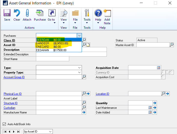 To delete purchases that are not showing 0 as the unapplied amount, instead of selecting the purchases from the dropdown use the big Purchase button in the ribbon.Ā That will open up the list of all purchases available for attaching that were charged to the fixed asset purchase posting accounts.Ā From there you can select and delete them using the Delete button in the ribbon (one by one, ticking the boxes to try to delete in bulk does not work).