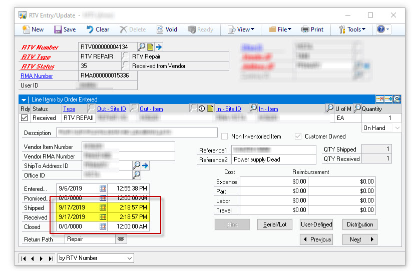 Greetings, It’s been some time since I used RTV in the FS module, so I am a bit rusty.Ā Does anyone out there know why my RTV Shipped and Received dates would be the same (date and time)?Ā I’m not sure if this is proper functionality based on workflow, or user error, or system error.Ā Ā Any advice would be appreciated. Thanks in advance.