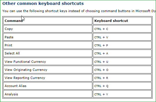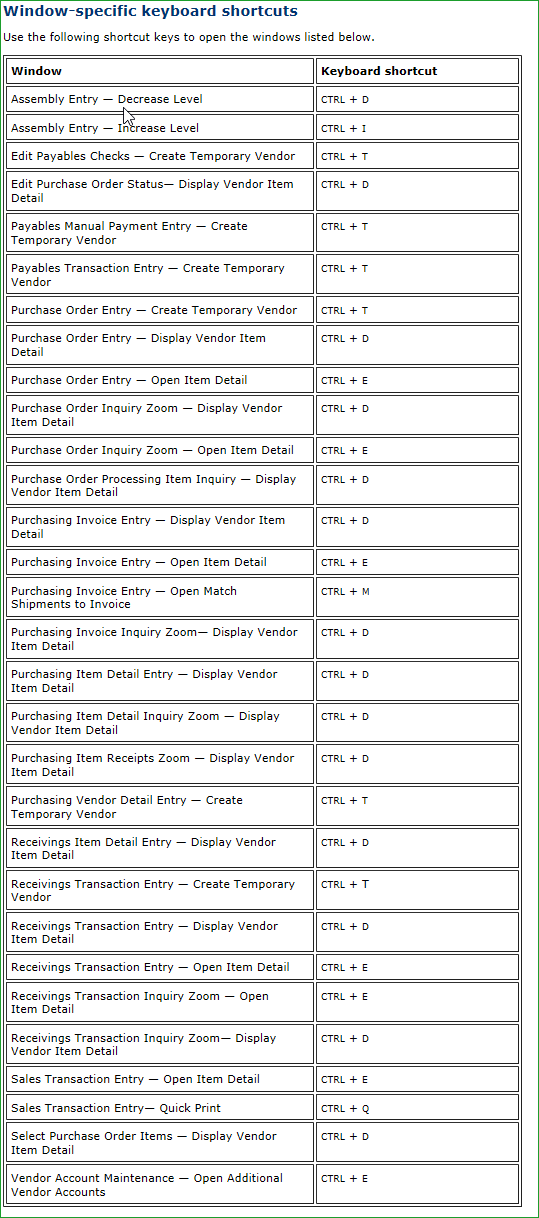 I’ve searched the GP database and haven’t quite seen a clear answer to this…Ā Where do keyboard shortcuts live and how can we see what’s setup?Ā I’m specifically curious for SOP, but other areas would be interested if they knew they existed.Most recently I implemented Avalara AvaTax, which the default setup includes Ctrl+T will calc tax.Ā It doesn’t and I think that’s because Ctrl+T is also setup for “Quick Track”, which I don’t know what that is and it doesn’t do anything.Ā So, how do I get rid of “Quick Track” (and others like this) and is there some way I can see everything that may be setup so we can use these accurately?Ā Ā