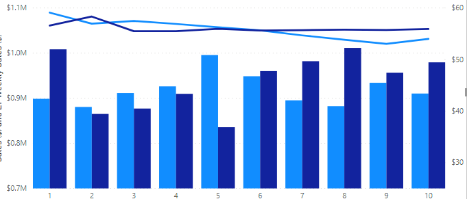 I did it by using clustered line and column chart putting different measures in each field well. I didn’t use drill down in my example I just clicked on a bar value and it cross-filtered. This type of chart allows for a second Y axis(I did not use in my example).