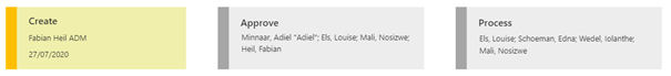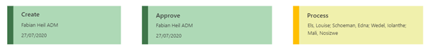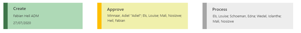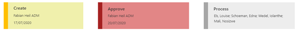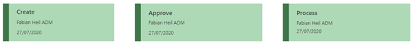 Depending on the current status, the steps are yellow/gray or green and contain the users to approve or the user who already approved.So in general, the other processes will have a pretty similar structure. Some fields on the left and 3 or 4 approval steps on the right.