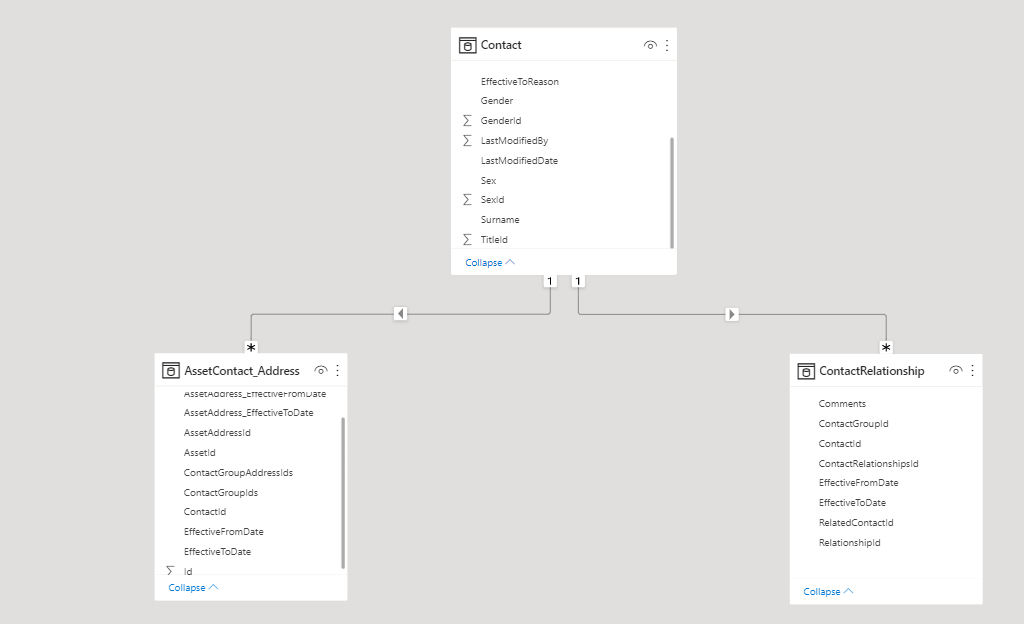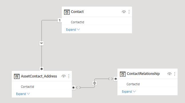 That would give you all of the data you want, but it’s pretty confusing.Ā Instead of the two rows from AssetContact_Address or the four rows from ContactRelationship, now you have 8 rows – basically it multiplied the rows together.Ā For this small example, that’s not a big deal, but you can see that for the larger data, that would get to be a lot of unnecessary duplication, and produce a table that’s very hard to figure out.Ā By the way, if you are wondering what I did to create that table, I changed the relationships in the data model, so that it looks like this instead: