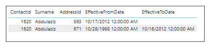 If I ask Power BI, what information is in the AssetContact_Address table for my contact, then Power BI can answer that question with this sort of table, where it shows me the two rows from AssetContact_Address table and just duplicates the information from the Contact table for each of those rows.Ā That’s logical, and easy to understand: