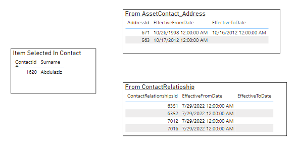Now, if I ask Power BI, what information is in both the AssetContact_Address table and the ContactRelationship table, for my contact, and show it to me in just one table, then it’s pretty confusing.Ā Power BI is wondering how can I show the information from both of those tables on the same rows?Ā Is the user looking for something like this: