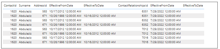 I think it would be easier to understand the issue if you take a look at a smaller portion of the data.Ā For example, let’s take a look at ContactId = 1620 from the Contact table.Ā That item has 2 rows associated with it in the AssetContact_Address table, and it has 4 rows? associated with it in the ContactRelationship table (see image below).