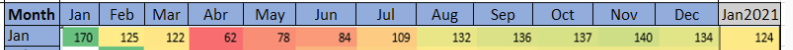 For example, according to the January reference below, I need to apply the color scaling as lowest vale= Red; Middle Value = Yellow and Highest Value = Green.