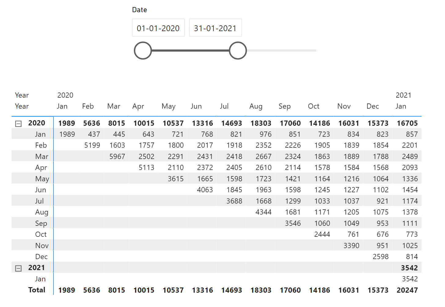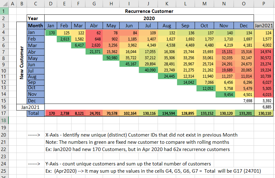 Cohort Value = VAR _currentcolumnSOM = SELECTEDVALUE ( 'Date Table'[Month Start] ) ----------------------------------------- VAR __summarytable = SUMMARIZE ( 'Alt Date Table', 'Alt Date Table'[Month Start], "@customercount", VAR _currentrowSOM = SELECTEDVALUE ( 'Alt Date Table'[Month Start] ) VAR __rlvntable1 = CALCULATETABLE ( VALUES ( Table1[Customer ID] ), Table1[StartofMonth] = _currentcolumnSOM ) --1st take the customer ids based on column SOM VAR __rlvntable2 = CALCULATETABLE ( VALUES ( Table1[Customer ID] ), Table1[StartofMonth] = _currentrowSOM ) --2nd take the customer ids based on row SOM VAR __rlvntable3 = CALCULATETABLE ( VALUES ( Table1[Customer ID] ), Table1[StartofMonth] < _currentrowSOM ) --3rd take the cumulative customer ids based on row SOM < current row SOM VAR __rlvntable4 = FILTER ( __rlvntable2, NOT ( Table1[Customer ID] IN __rlvntable3 ) ) --4th remove from 2nd the customer ids which are there in 3rd. This gives the unique customers for each row SOM VAR __rlvntable5 = FILTER ( __rlvntable4, Table1[Customer ID] IN __rlvntable1 ) --5th find the customer ids in 4th which are there in 1st. The customers IDs of row SOM which is still present in the column SOM. RETURN COUNTROWS ( __rlvntable5 ) ) ----------------------------------------------- RETURN SUMX ( __summarytable, [@customercount] ) ?PFA the pbix file also.