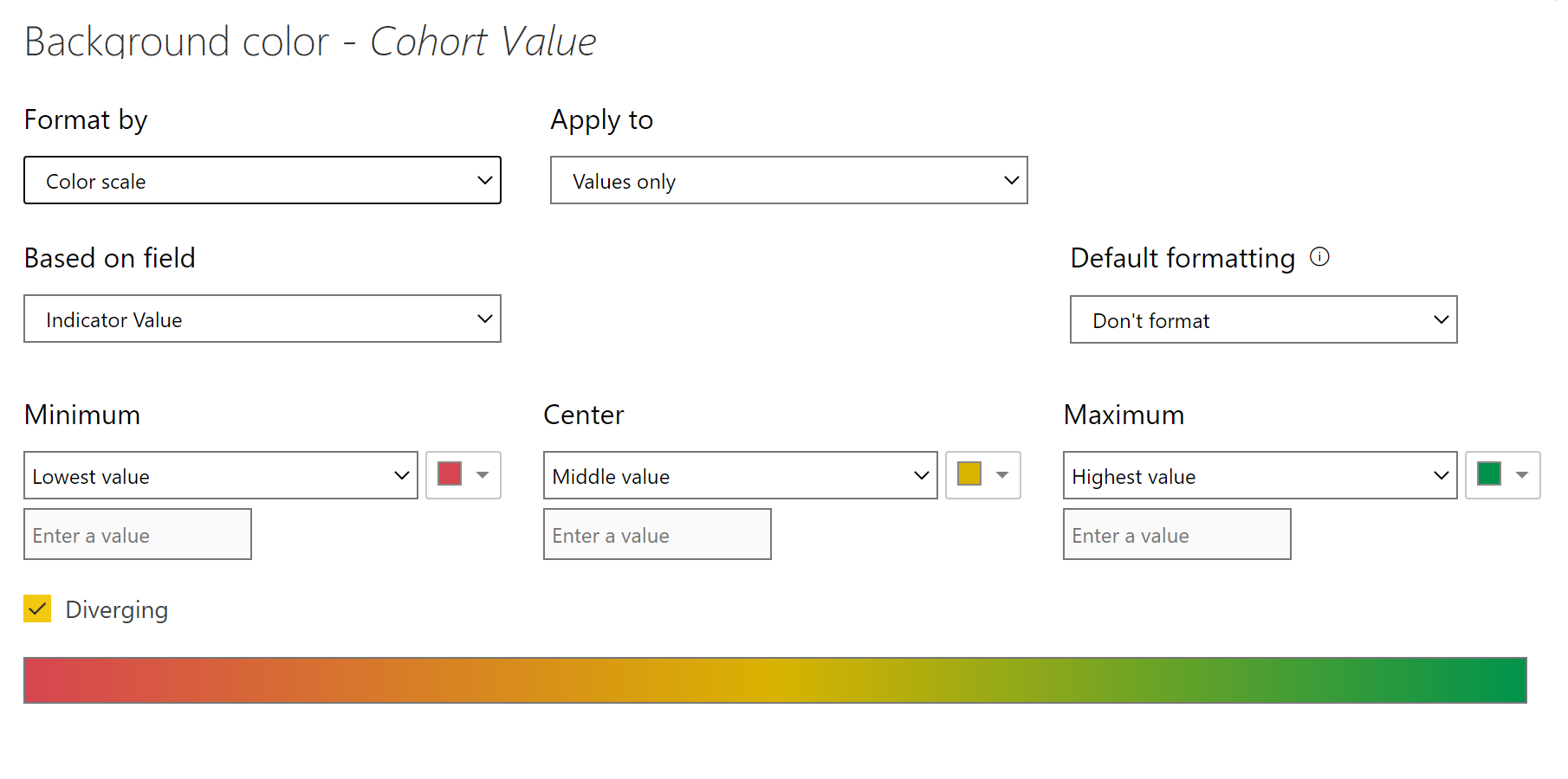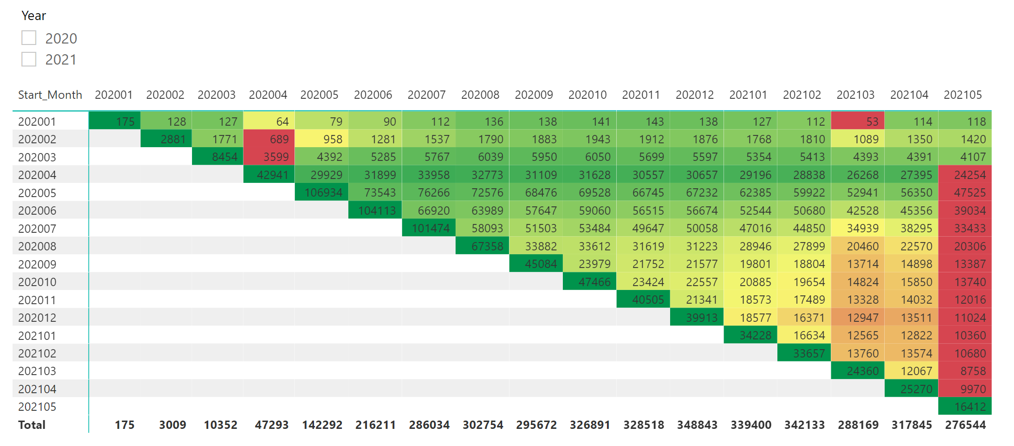 Indicator Value = VAR _currentcolumn = SELECTEDVALUE ( 'Date Table'[Month Start] ) VAR _currentrow = SELECTEDVALUE ( 'Alt Date Table'[Month Start] ) -------------------------------------------------------------- VAR _proportion = IF ( _currentrow > _currentcolumn, BLANK (), --run this only in the relevant cells ----------------------------- VAR _currentcohortvalue = [Cohort Value] VAR _maxSOM = CALCULATE ( MAX ( 'Date Table'[Month Start] ), ALLSELECTED ( 'Date Table' ) ) VAR _minSOM = CALCULATE ( MIN ( 'Date Table'[Month Start] ), ALLSELECTED ( 'Date Table' ) ) ----------------------------- VAR __rlvntSOMtable1 = CALCULATETABLE ( VALUES ( 'Date Table'[Month Start] ), ALLSELECTED ( 'Date Table' ), 'Date Table'[Month Start] >= _minSOM && 'Date Table'[Month Start] <= _maxSOM ) --build a table with all the start month values in the slicer selection ignoring the filter from the start month column in the matrix VAR __rlvntSOMtable2 = SELECTCOLUMNS ( __rlvntSOMtable1, "@MonthStart", 'Date Table'[Month Start] & "" ) --remove the lineage to the date table ------------------------------------------------------------------------------------- --create a temp table with the cust count for all the columns in the current row VAR __ranktable = ADDCOLUMNS ( __rlvntSOMtable2, "@custcount", VAR _currentrowSOM = SELECTEDVALUE ( 'Alt Date Table'[Month Start] ) VAR _currentcolumnSOM = DATEVALUE ( [@MonthStart] ) --since this is in text format bcoz of the addition of "" to remove lineage, convert it back to date value VAR __rlvntable1 = CALCULATETABLE ( VALUES ( Table1[Customer ID] ), Table1[StartofMonth] = _currentcolumnSOM ) --1st take the customer ids based on column SOM VAR __rlvntable2 = CALCULATETABLE ( VALUES ( Table1[Customer ID] ), Table1[StartofMonth] = _currentrowSOM ) --2nd take the customer ids based on row SOM VAR __rlvntable3 = CALCULATETABLE ( VALUES ( Table1[Customer ID] ), Table1[StartofMonth] < _currentrowSOM ) --3rd take the cumulative customer ids based on row SOM < current row SOM VAR __rlvntable4 = FILTER ( __rlvntable2, NOT ( Table1[Customer ID] IN __rlvntable3 ) ) --4th remove from 2nd the customer ids which are there in 3rd. This gives the unique customers for each row SOM VAR __rlvntable5 = FILTER ( __rlvntable4, Table1[Customer ID] IN __rlvntable1 ) --5th find the customer ids in 4th which are there in 1st. The customers IDs of row SOM which is still present in the column SOM. RETURN COUNTROWS ( __rlvntable5 ) ) -------------------------------------------------------------------------------- VAR __ranktable2 = FILTER ( __ranktable, [@custcount] <> BLANK () ) --filter out rows which has blank customer counts (rows where SOM < current column date) -------------- --filter the table for the current cell VAR __rlvntranktable = FILTER ( __ranktable2, [@MonthStart] = _currentcolumn & "" ) -- & "" as [@MonthStart] is string caused by the breakage of lineage ----------------------------------------------------------- --calculation of the proportion VAR _stddeviation = STDEVX.P ( __ranktable2, [@custcount] ) VAR _maxcount = MAXX ( __ranktable2, [@custcount] ) VAR _mincount = MINX ( __ranktable2, [@custcount] ) VAR _currentcellcount = MAXX ( __rlvntranktable, [@custcount] ) VAR _countproportion = SWITCH ( TRUE (), _currentcellcount = _maxcount, 1, _currentcellcount = _mincount, 0, ABS ( 1 - DIVIDE ( _stddeviation, _currentcellcount, BLANK () ) ) --absolute value ) --------------------------------------------------------- RETURN _countproportion ) RETURN _proportionThis measure is then used in the conditional formatting of the visual.